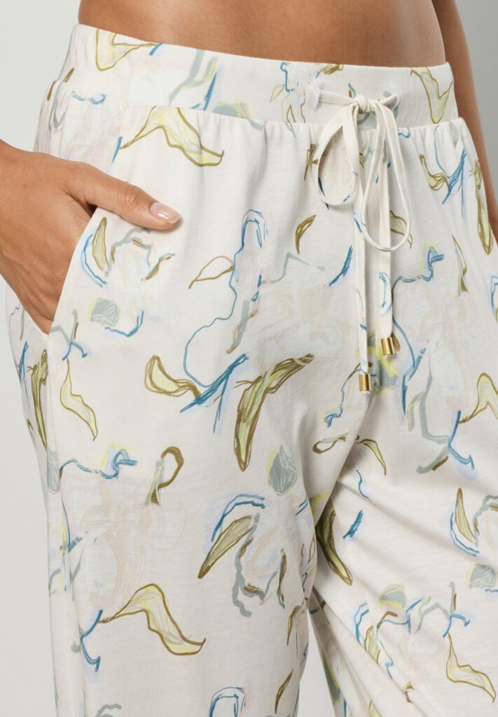 These patterned trousers combine sophisticated design and sustainable material. The leg of these long casual trousers is slightly tapered at the bottom. The elastic waistband with drawstring and two practical side pockets ensure everyday comfort. The print with petals in an animal look was created exclusively by our in-house print designer. The skin-friendly single jersey is also manufactured locally at our in-house production facility in Austria. It consists of half eco-friendly TENCEL™ modal fibres and half air-permeable cotton.