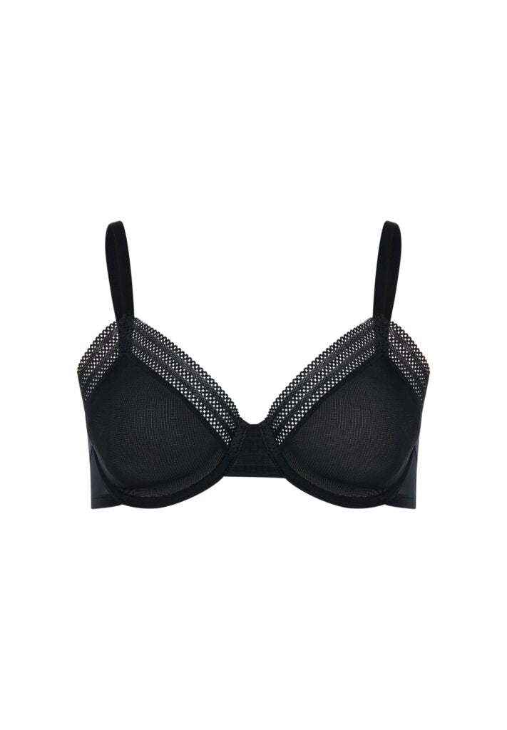 This delicate underwire bra with moulded cups embodies clean chic at its best. For maximum comfort, this lightweight and airy bra without cups has no seams at all. The cups are reinforced with tulle. A fine tulle band in an understated design adorns the entire front of the neckline and ends flat at the décolleté. This delicate sheer bra with supportive underwire does not show under tight clothing and offers a secure hold. The subtle look of this modern undergarment is typical of HANRO: understated style, first-class workmanship.