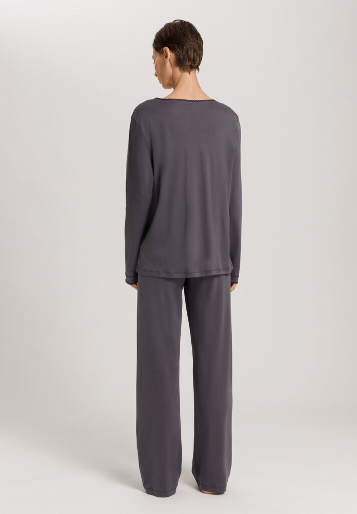 The perfect pyjamas is the headline for this long pyjama set! Delicately contrasting crochet stitching frames the V-shaped neckline, button placket and sleeve cuffs. The loose cut with elastic comfort waistband ensures optimum legroom. The soft cotton interlock absorbs moisture during sleep and has breathable properties. The mercerisation process gives the fibre greater resistance and a slight sheen.
