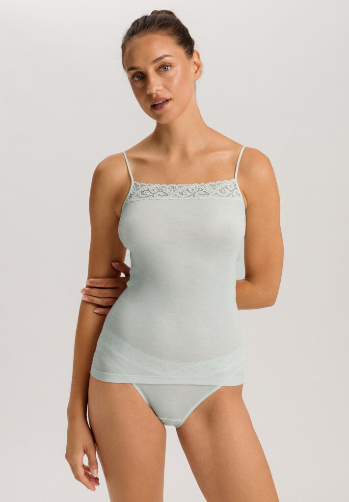 Einen feminin-eleganten Look zaubert das Spaghetti-Top aus der HANRO-Serie Moments. Der Style besticht mit einer körpernahen Silhouette, seidenweicher Baumwoll-Qualität, einer Dekoration aus französischer Spitze am geraden Ausschnitt und seitennahtfreier Verarbeitung. Ein perfekter Style zu Blazer & Co.