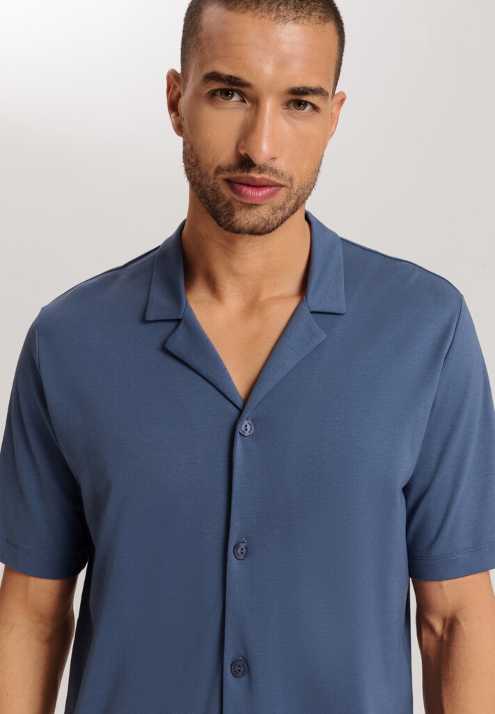 Moderno pijama para hombre confeccionado en 100% algodón. Suave tejido interlock con un diseño elegante. Pantalón corto de pijama con cuello y botones. Pantalón corto de pijama con bolsillos laterales.