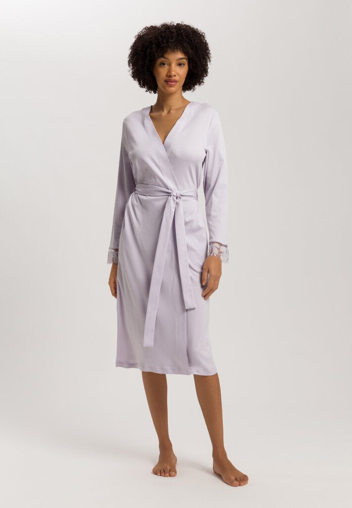 Esta bata hasta la rodilla con dos bolsillos envuelve con gracia a la mujer que la lleve puesta. Las mangas largas están ribeteadas con una ligera cinta bordada MADE IN AUSTRIA. El equipo de diseño de HANRO ha creado flores decorativas de gasa sobre fino tul exclusivamente para esta prenda de noche y de día. El cierre con el cinturón de anudar a juego crea una favorecedora silueta con escote en V. A las mujeres más entendidas les encanta la perfecta gestión de la humedad que ofrece este suave tejido de algodón de fabricación propia.