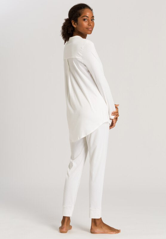 Sencillez elegante en estado puro, el pijama Pure Essence está confeccionado en algodón 100% mercerizado especialmente suave. Con una parte superior de manga larga de trapo y botones delanteros, y unos elegantes pantalones con cintura elástica cubierta y tobillos afilados, este pijama es el look perfecto de ropa de dormir discreta.