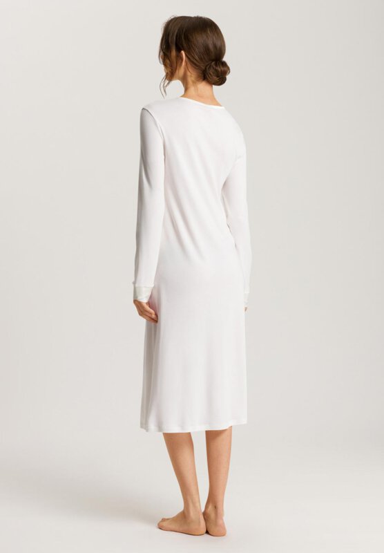 Este camisón de manga larga de la gama Virginia de HANRO ofrece una comodidad óptima para el día y la noche, por lo que es ideal para dormir y descansar. Está confeccionado en suave interlock producido en Austria. Por supuesto, resulta agradable al tacto. Otro punto destacado de la ropa de dormir son las inserciones de seda elástica. Esto es puro lujo para la piel.