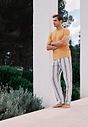 El diseño a rayas con una fina textura es una interpretación moderna y urbana de estos pantalones largos tejidos en algodón 100% ligero. El efecto 3D da al clásico un giro inesperado. Combinados con la camisa de manga corta a juego, los pantalones largos se convierten en un atuendo veraniego con estilo para viajar, el tiempo libre y la oficina en casa. La cómoda cintura, los dos bolsillos y la bragueta con botón garantizan una comodidad relajada para el día a día. En cuanto al material, la tela tejida a partir de fibras naturales Made in Austria promete una gran compatibilidad con la piel, transpirabilidad y durabilidad.