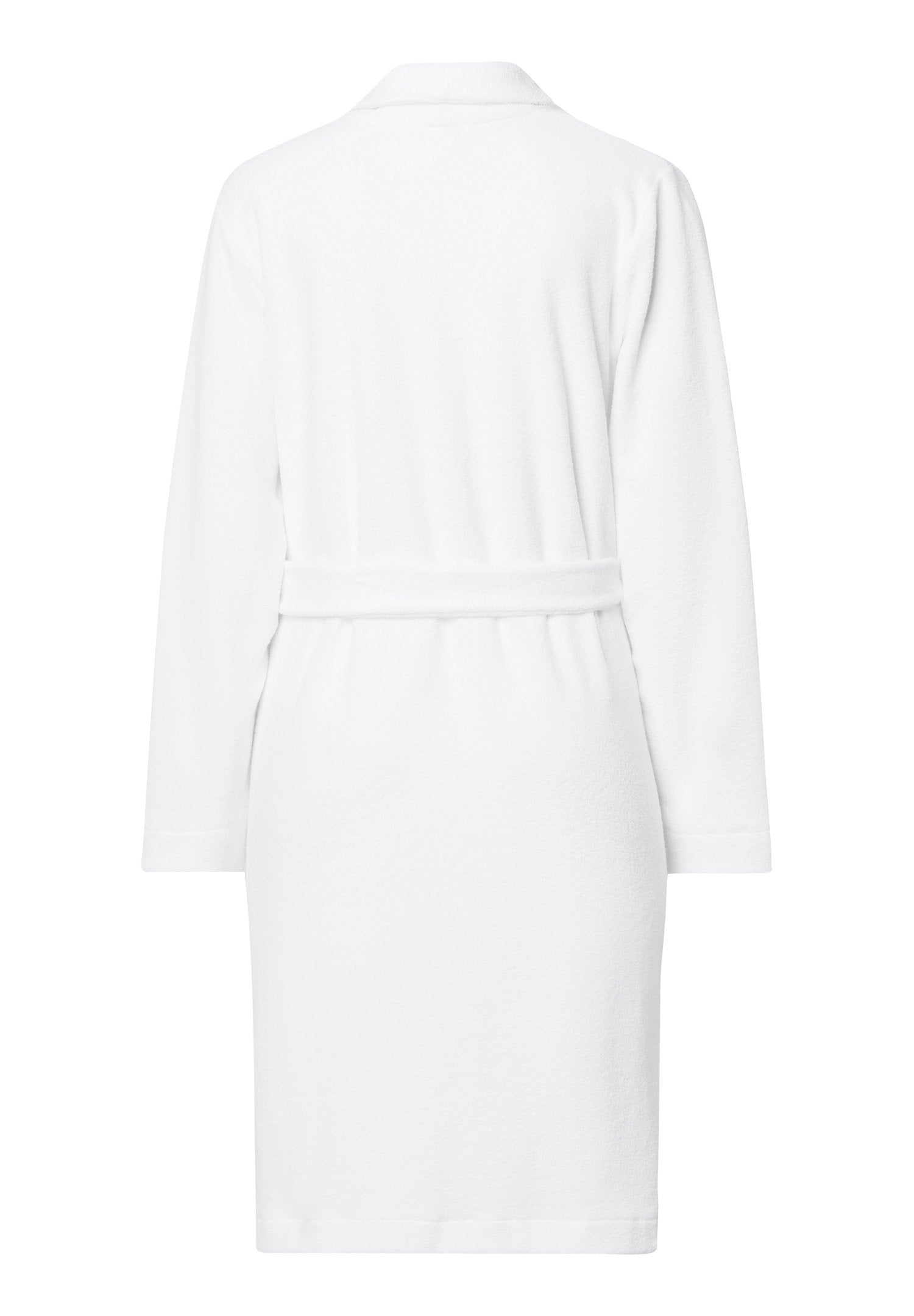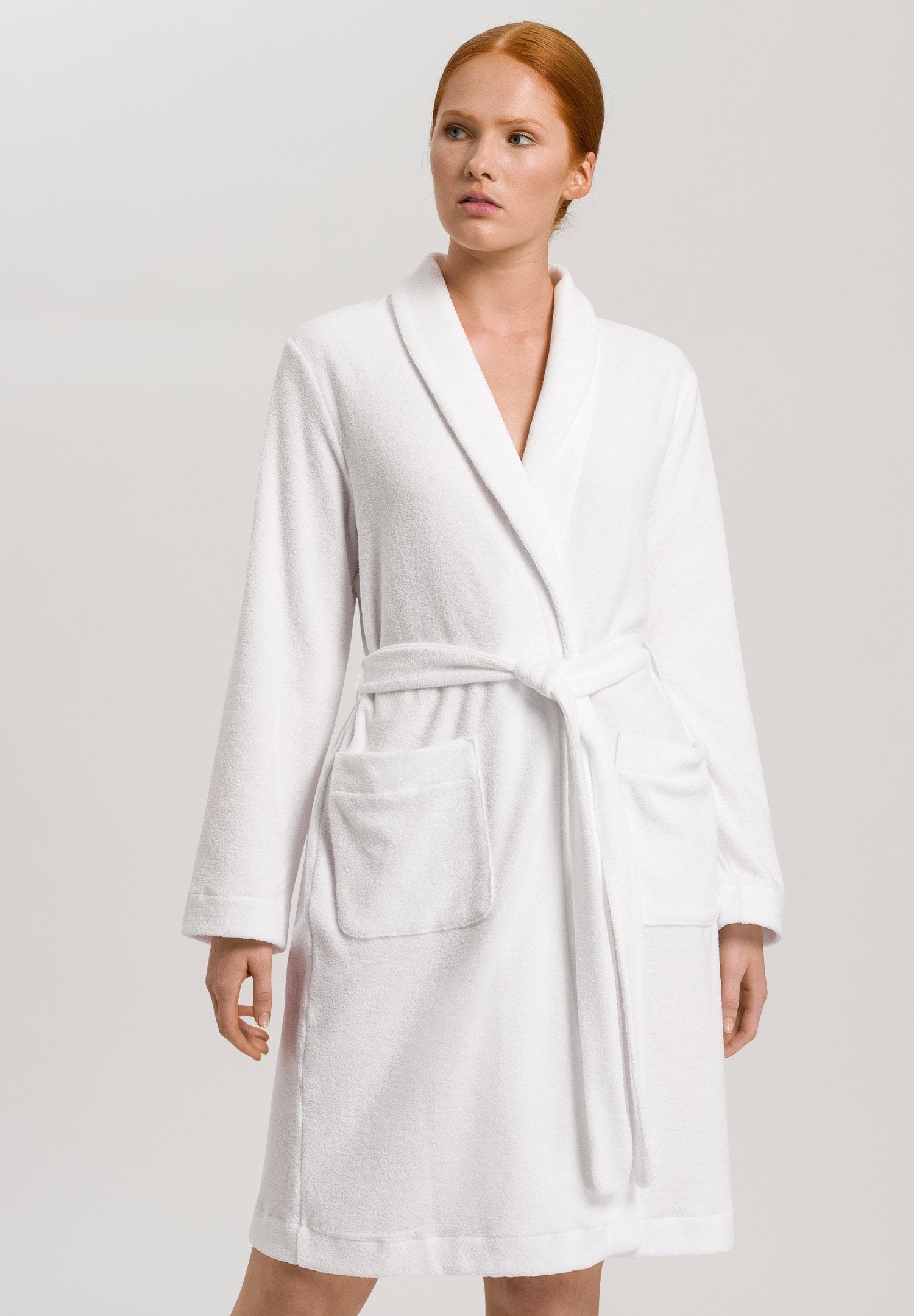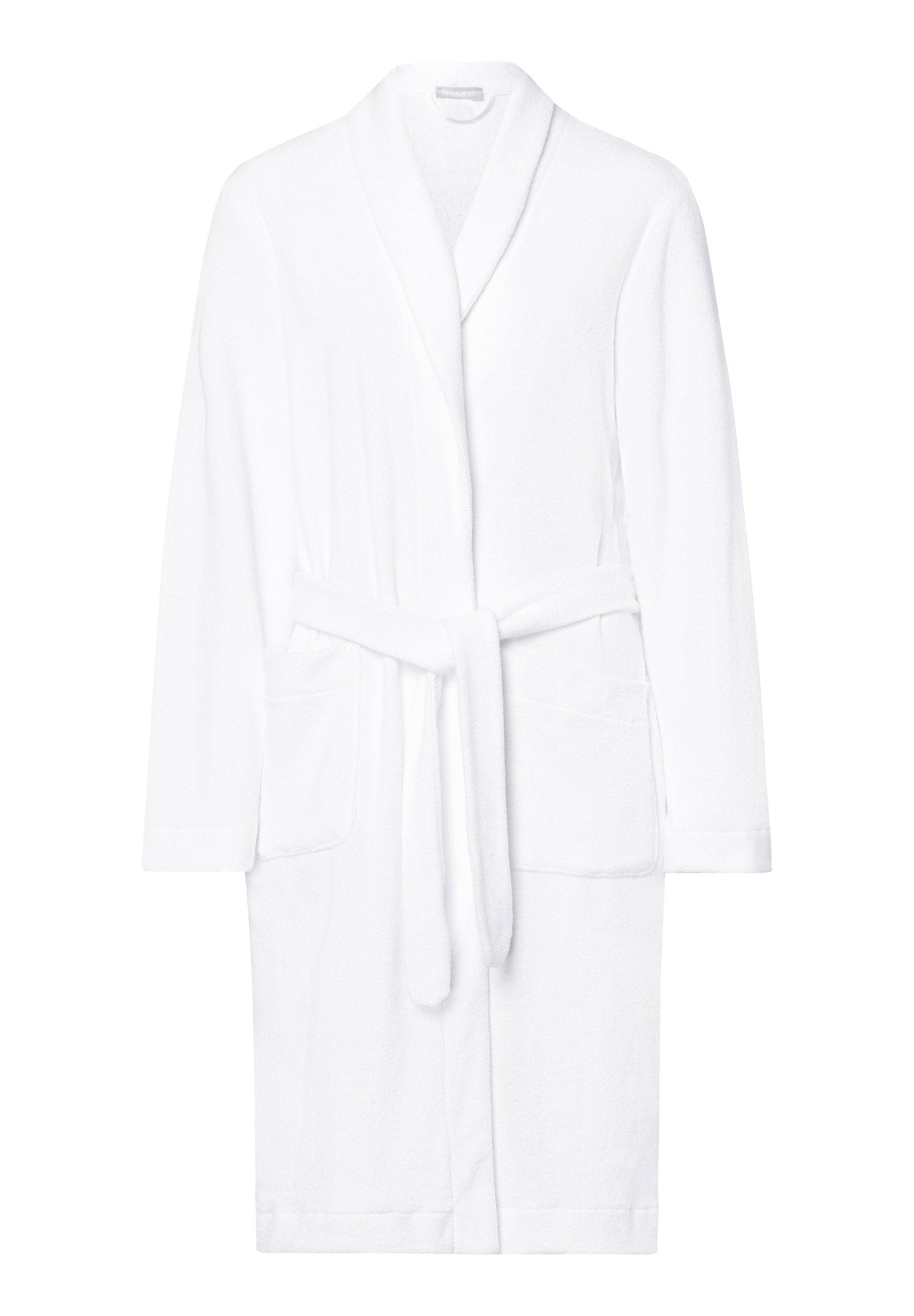 En la gama Robe Selection, HANRO ofrece un albornoz suave y acogedor confeccionado en felpa de felpa. El albornoz también presenta un corte clásico y cómodo, cuello chal, dos bolsillos rectos de parche y un cinturón de anudar. La cómoda longitud hasta la rodilla también contribuye a la sensación de comodidad.