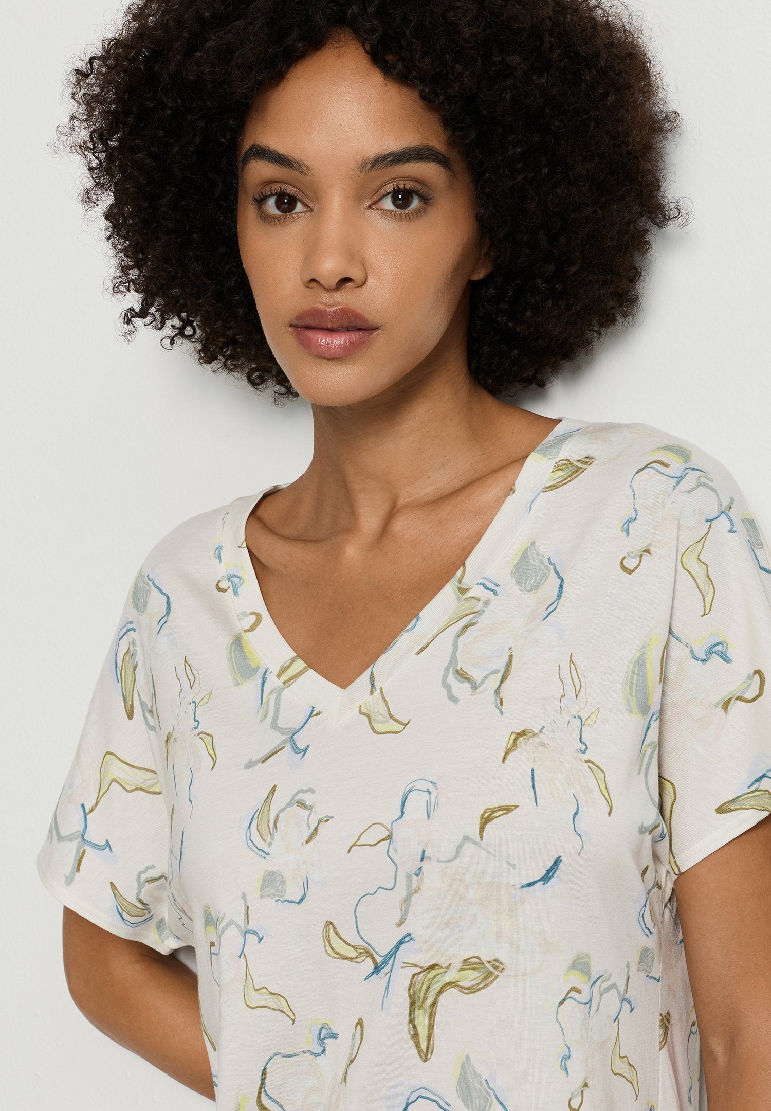 Este camisón corto con mangas recortadas es suave y transpirable. Esto se debe principalmente a la calidad especial del material: 50% de modal TENCEL™ de origen botánico y 50% de algodón respetuoso con la piel. La combinación de estas dos fibras garantiza una agradable regulación de la humedad durante el sueño. Al mismo tiempo, el modal TENCEL™ es conocido por sus colores ricos e intensos. El cómodo camisón con un ligero escote de pico tiene una femenina caída acampanada y se puede llevar durante el día como prenda de descanso, vestido para estar por casa o para desayunar en una terraza durante las vacaciones.