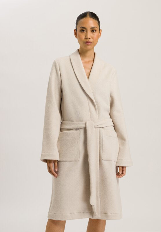 HANRO bietet in der Serie Robe Selection einen kuschelweichen Bademantel aus Fleece-Plüsch. Der Mantel begeistert außerdem mit einem klassischen, bequemen Schnitt, Schalkragen, zwei gerade aufgesetzten Taschen und Bindegürtel. Die komfortable, knieumspielende Länge trägt zusätzlich zum Rundumwohlgefühl bei.