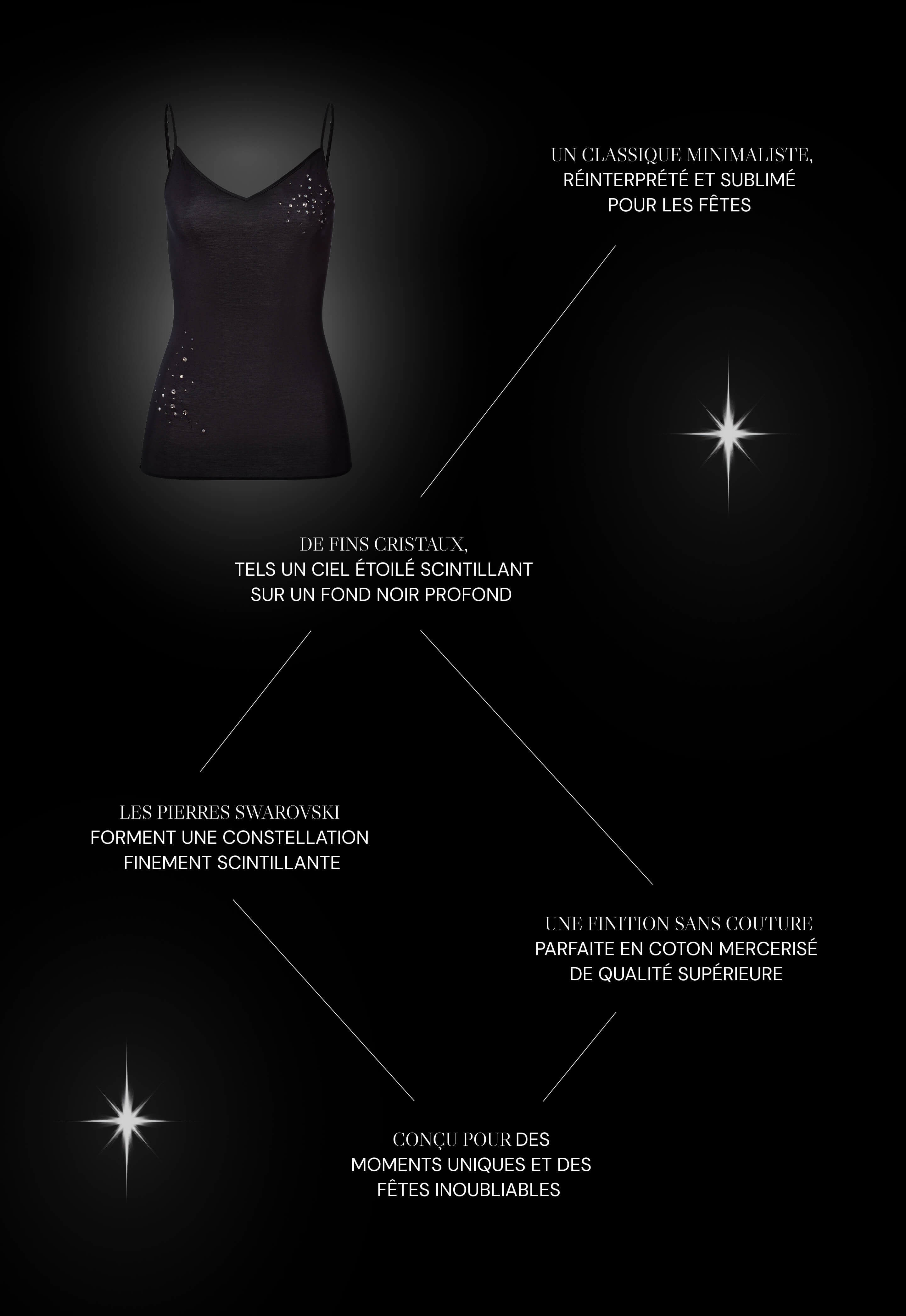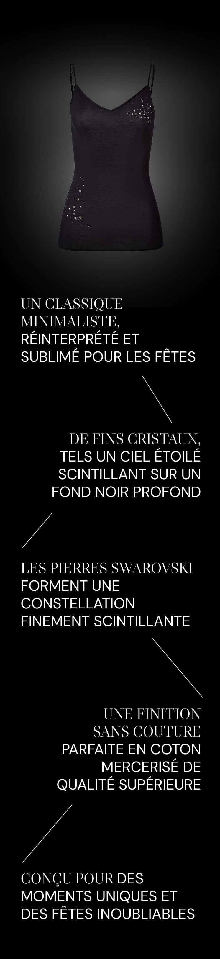 Pour marquer le 40èmeanniversaire de « Cotton Seamless », HANRO présentera fin 2025 un produit phare : le haut spaghetti iconique « Cotton Seamless », fruit d'une collaboration exclusive avec Swarovski. De fins cristaux, tels un ciel étoilé scintillant sur un fond noir, transforment ce best-seller minimaliste en une pièce festive élégante, entre sobriété et glamour.