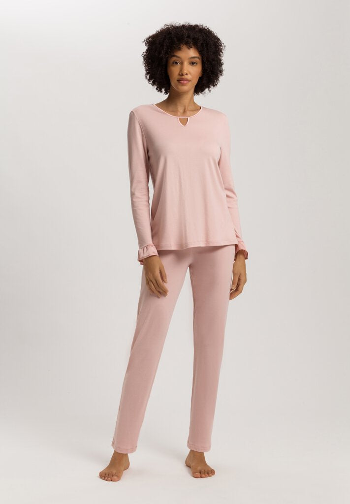 Ecco come la semplice eleganza si concretizza nell'intimo da notte: la parte superiore di questo pigiama propone un taglio leggermente svasato, mentre le maniche lunghe sono rifinite con polsini in seta sobriamente arricciati. Tuttavia, l'elemento che attira l'attenzione per eccellenza è la particolare scollatura con bordi in seta scintillante. Grazie all'elastico in vita, i pantaloni del pigiama a gamba lunga sono comodi da indossare. Un autentico bestseller: il morbido interlock MADE IN AUSTRIA è realizzato per il 50% in modal TENCEL™ di origine botanica e per il 50% in cotone.