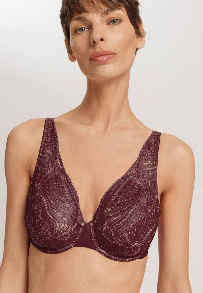 Questo incantevole reggiseno con ferretto propone un taglio high-apex e conquista con il suo raffinato design in pizzo. Le coppe rivestite in tulle sottile e le spalline leggermente più larghe offrono una vestibilità leggera e confortevole. Il misto viscosa, nella tipica qualità HANRO, si adagia dolcemente sui seni delicati. L'elegante tessuto in raso prodotto in Austria rende questo reggiseno high-apex un compagno elegante durante le festività dell'anno.