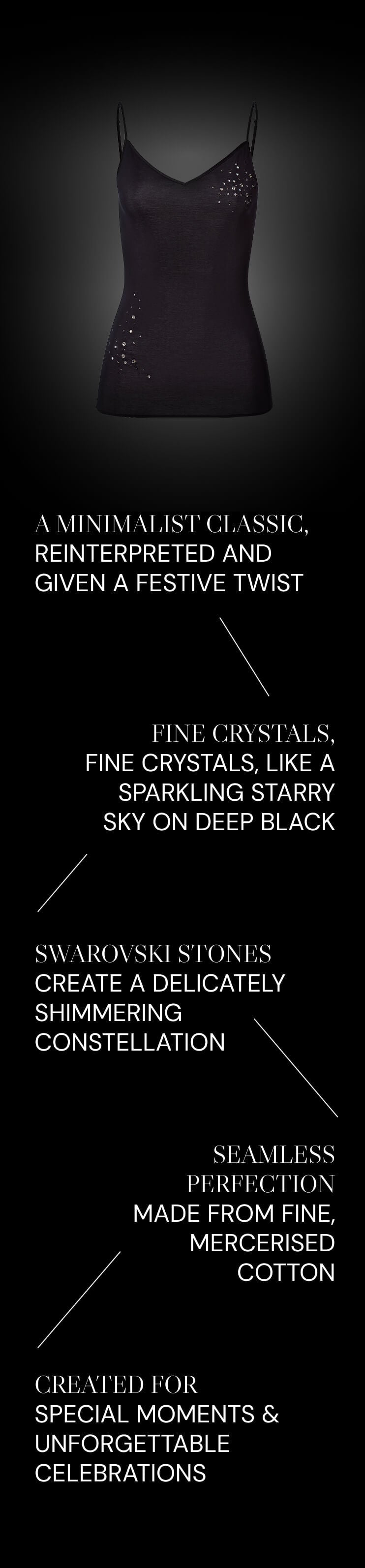 To mark the culmination of the 40th anniversary of Cotton Seamless, HANRO will present a special highlight at the end of 2025: the iconic Cotton Seamless Spaghetti Top in an exclusive collaboration with Swarovski. Fine crystals, like a sparkling starry sky on classic black, transform the minimalist bestseller into an elegant festive piece that strikes a balance between understatement and glamour.