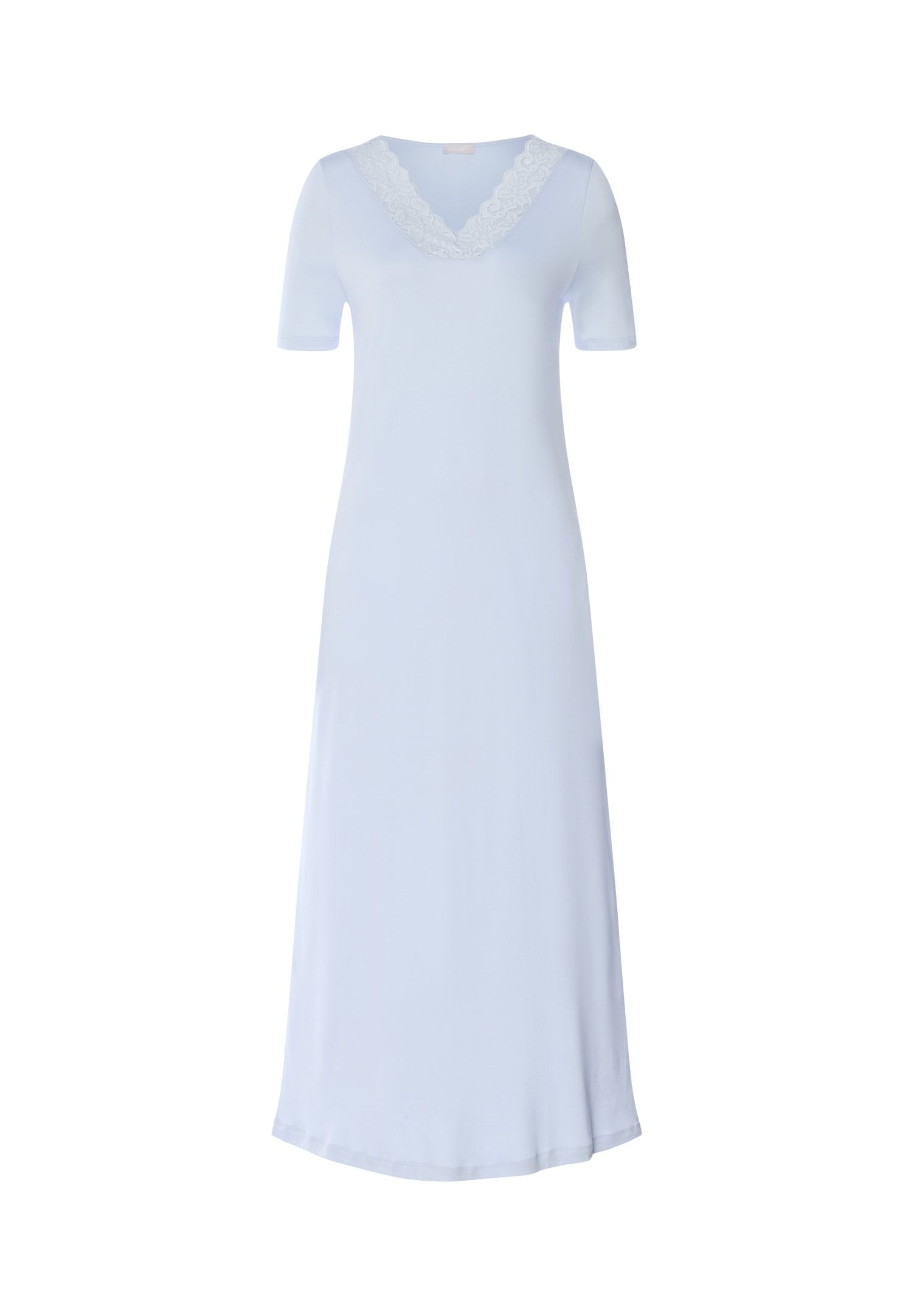 Elegant and feminine, the HANRO Moments short sleeve long gown is tailored from 100% mercerized cotton for incredible nighttime comfort. This special gown feels wonderful on the skin. Trimmed with lace along the v-neckline and features a long length, feel your best in this special sleep piece.