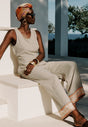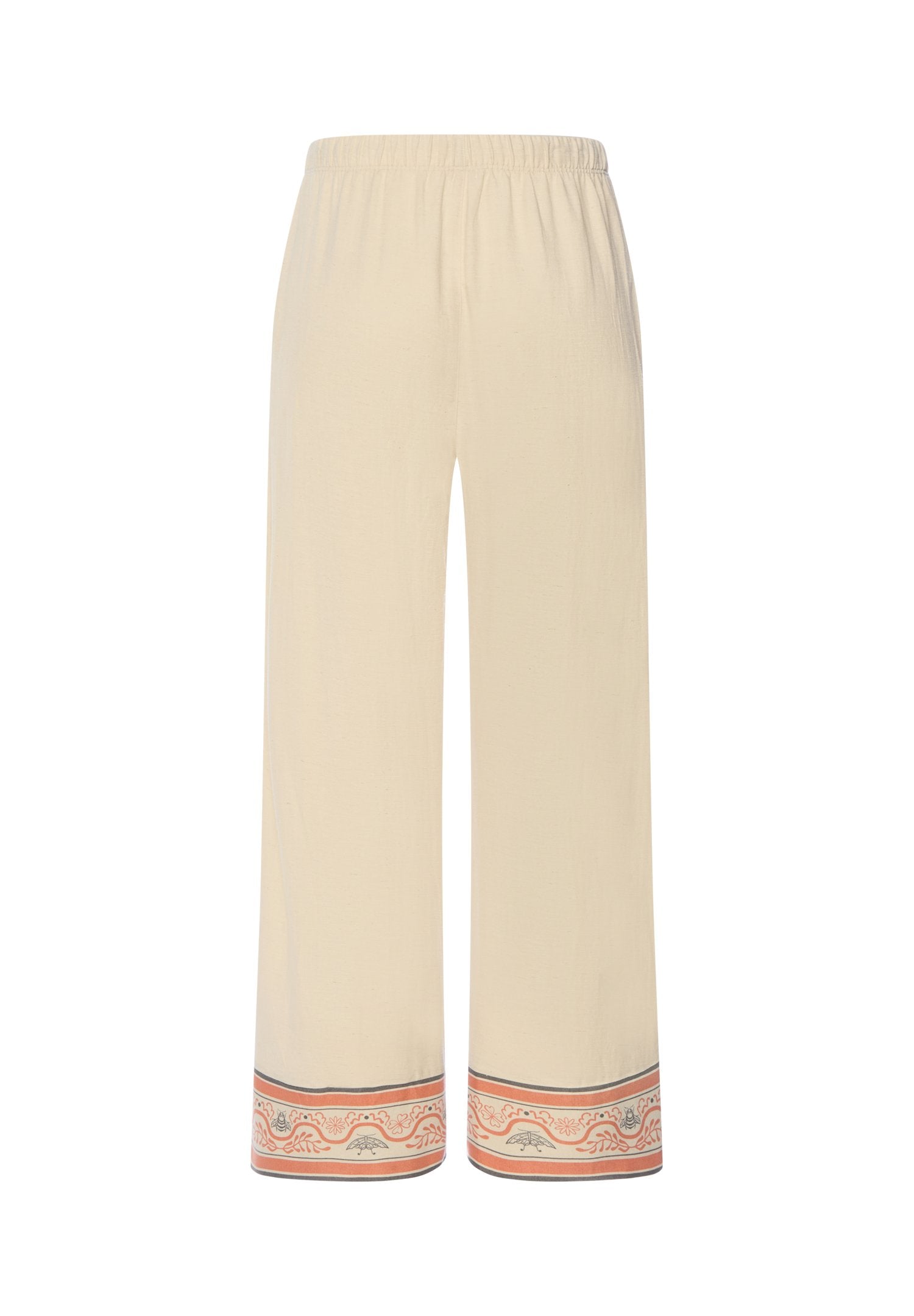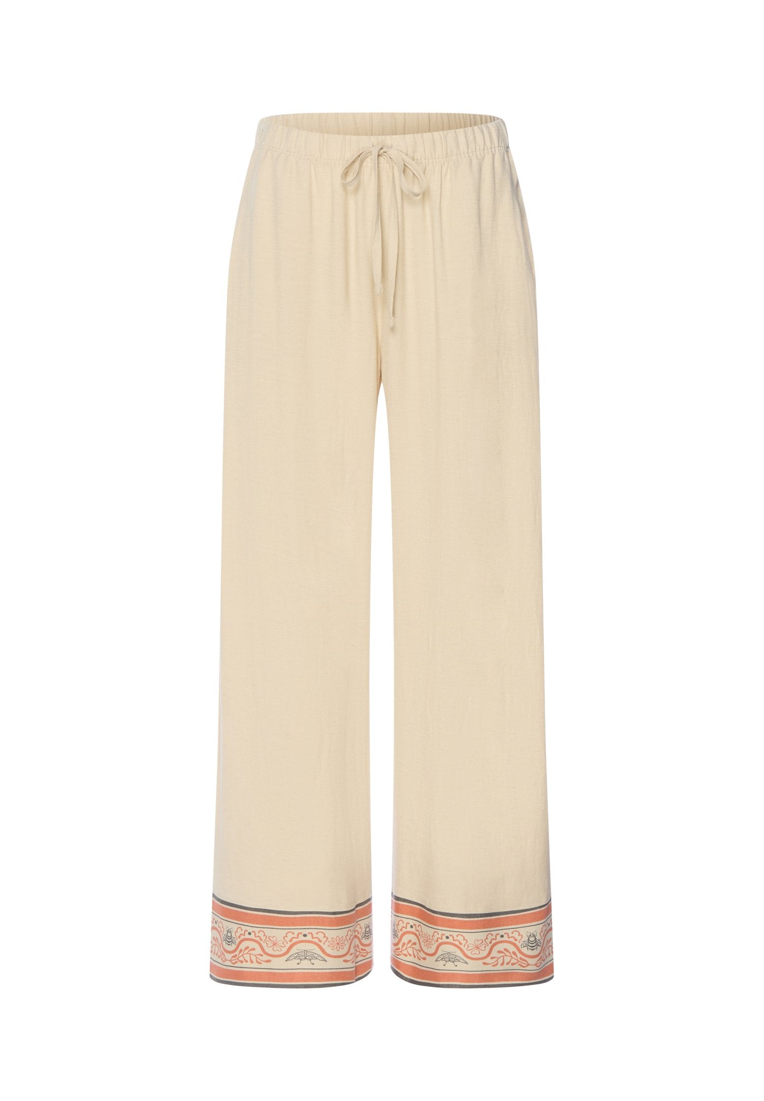 Silky-soft and silky-shiny, these fashionable 7/8-length trousers made from an innovative fabric blend are just the thing for light and airy summer moments! Cupro, also known as "vegan silk", is biodegradable and quickly wicks moisture away from the body. Linen directly absorbs up to 35% moisture from the air, yet still feels dry and has a cooling effect. The elastic waistband with drawstring and the two pockets on the cropped woven trousers ensure maximum comfort for everyday wear and when travelling. The printed trim along the hem was created exclusively for HANRO by our in-house print designer.